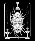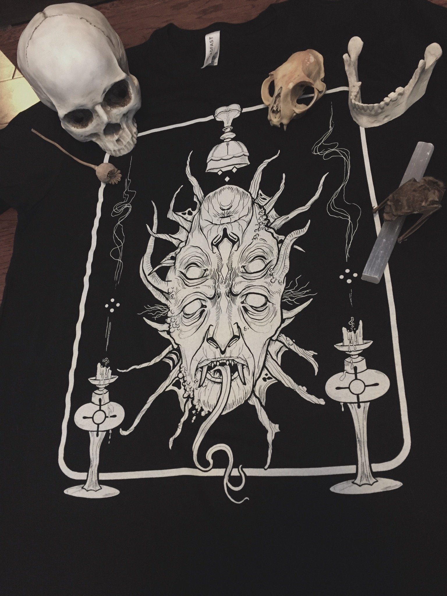 Demon altar print on black Threadfast Unisex Ultimate Tee 100A. Shirts are a cotton/poly blend. The cotton is sustainably made, the poly is made from recycled plastics, and the production consumes less petroleum, emits fewer greenhouse gases, and preserves water and energy. The dye in the shirt is also eco-friendly.