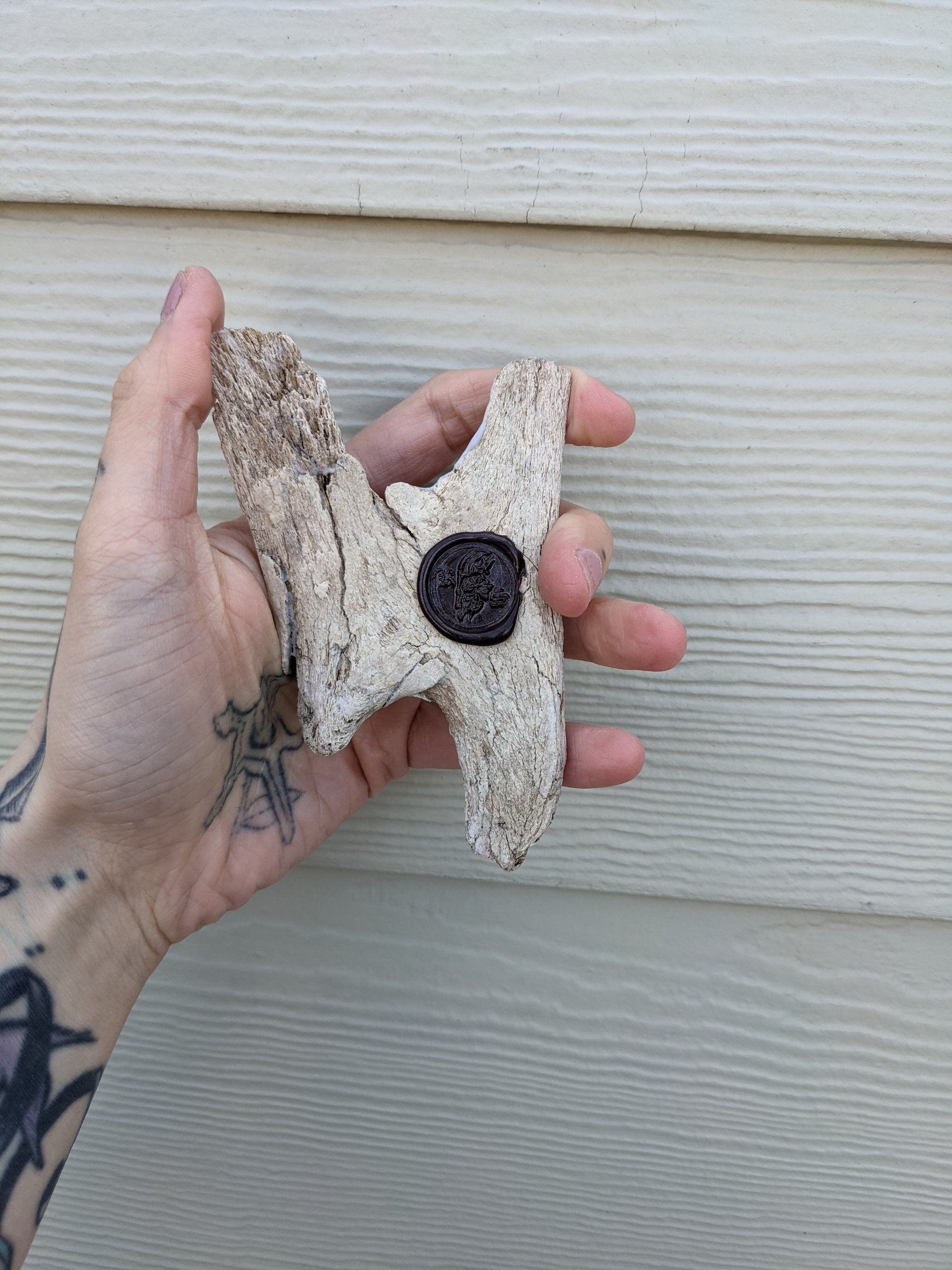Acrylic on found bone (specific animal unknown). Bone has been scrubbed, cleaned, degreased and whitened.