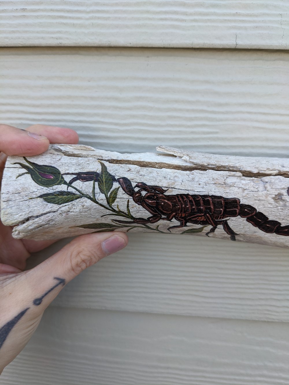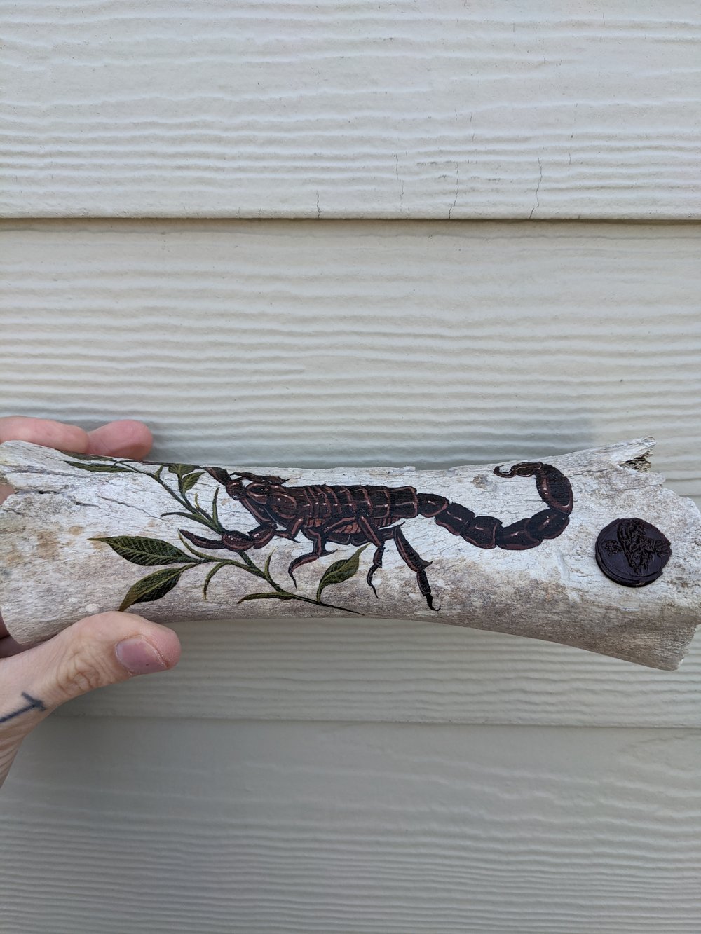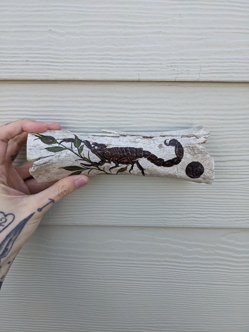 Acrylic on found bone (specific animal unknown). Bone has been scrubbed, cleaned, degreased and whitened.