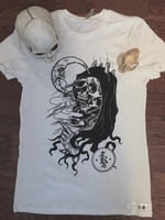 A skeleton hag having tongue tickles with the moon print- black on white Threadfast Unisex Ultimate Tee 100A. Shirts are a cotton/poly blend. The cotton is sustainably made, the poly is made from recycled plastics, and the production consumes less petroleum, emits fewer greenhouse gases, and preserves water and energy. The dye in the shirt is also eco-friendly.
